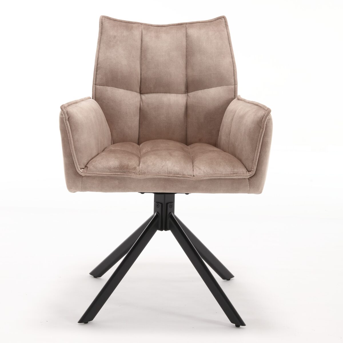 Esszimmerstuhl “Dani” in Velvet Beige. Elegant bezogen mit hochwertigem Samtstoff (Velvet) in Beige. Der Stuhl ist um 180° drehbar und mit einer Rückstellfunktion (Return-Memory) ausgestattet, die ihn automatisch in die Ausgangsposition zurückführt. Er steht auf einem schwarzen Metallgestell und verbindet zeitloses Design mit komfortabler Handhabung. Verkaufseinheit: 2 Stück.