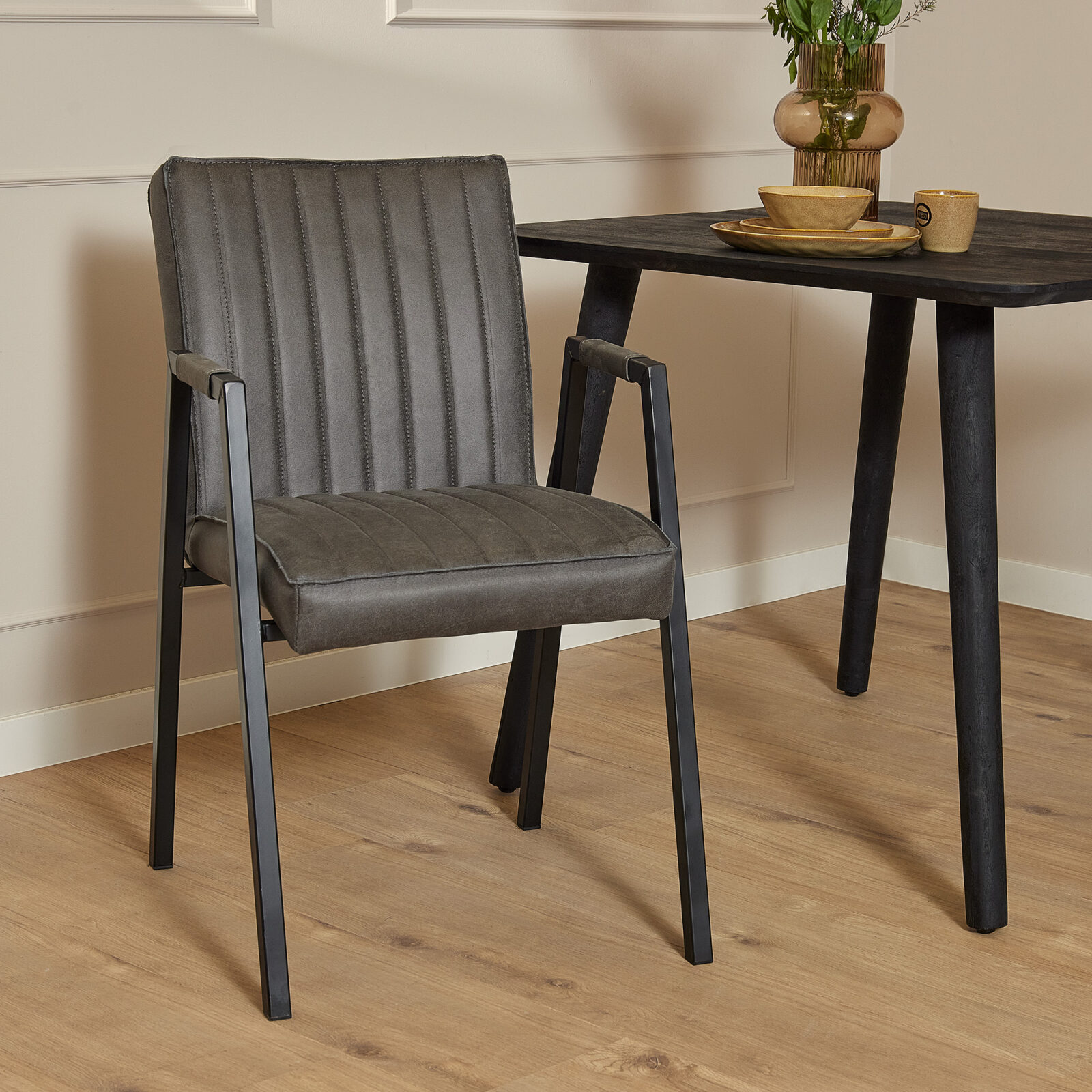 Der Esszimmerstuhl Tivoli überzeugt durch seine markante, industrielle Optik. Der Bezug besteht aus Bull Antraciet 67 Eco‑Leder und ist mit außenliegenden 5 mm Nähten sowie kontrastierendem Ziergarn hochwertig verarbeitet. Das Gestell ist aus Stahl gefertigt und mit matter schwarzer Lackierung versehen. Die Stühle werden ausschließlich im 2er‑Set verkauft.